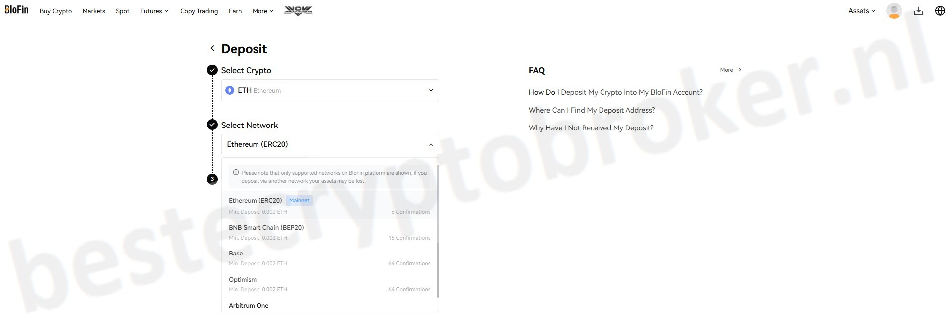 BloFin maakt het makkelijk om crypto te storten en op te nemen. Je kunt snel geld op je account zetten. Kies gewoon de munt die je wilt gebruiken. Kopieer dan het adres en stuur je crypto. Het geld staat meestal binnen een paar minuten op je account.