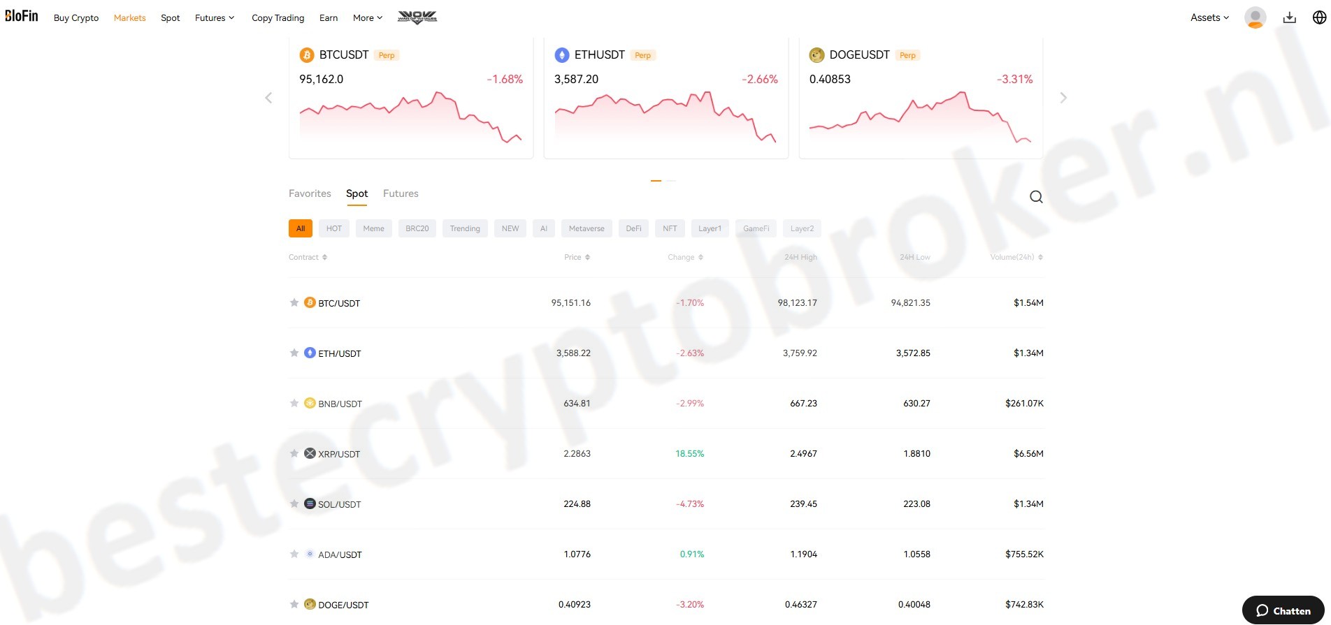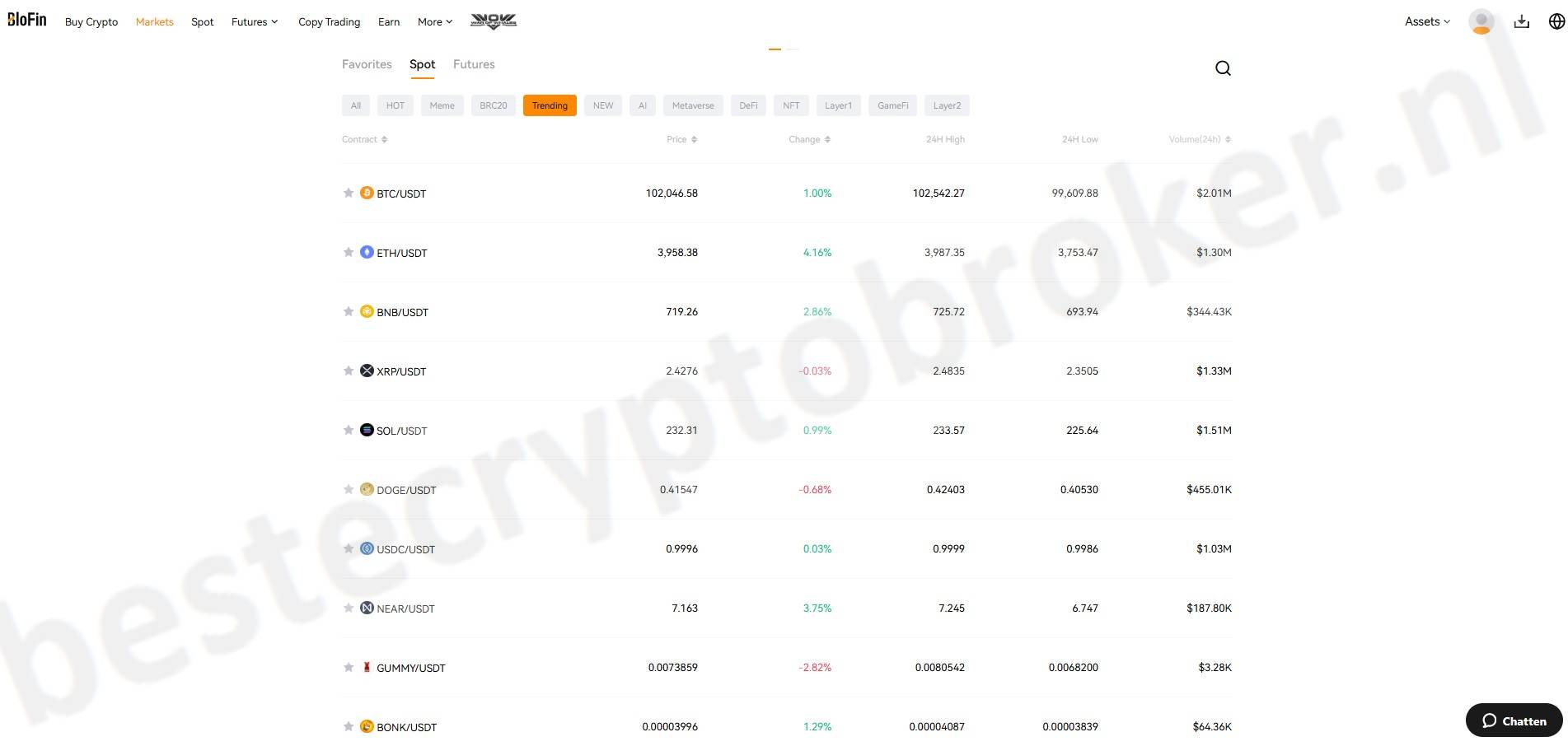 Je kunt op BloFin futures traden met hoge hefboom. Ook biedt het platform copy trading aan. Hiermee volg je de trades van ervaren handelaren. De interface is gebruiksvriendelijk en je hebt geen KYC nodig om te beginnen.