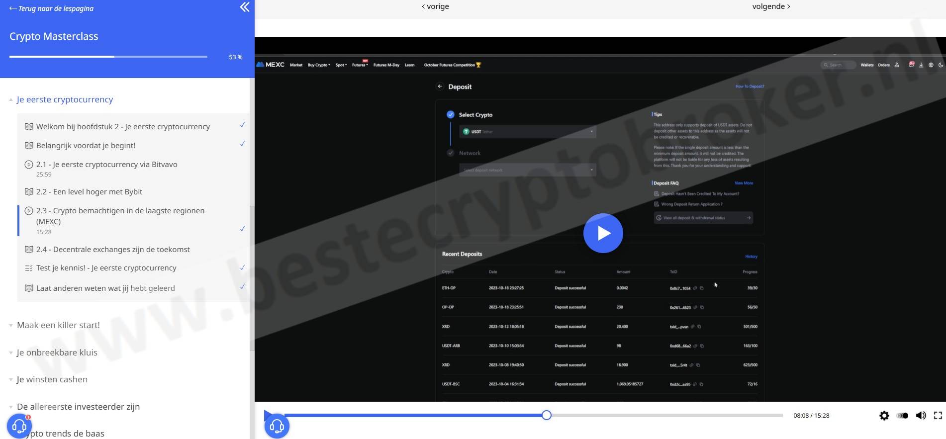 De Crypto Masterclass is een online cursus met meer dan 200 lessen over crypto. Het leert je alles over bitcoin, blockchain en hoe je kunt beginnen met crypto handel.