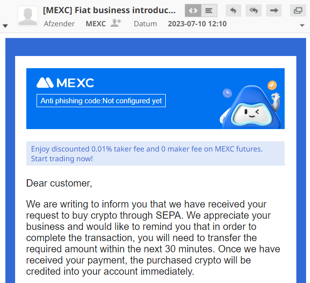 Stortingskosten | Mexc Global brengt geen stortingskosten in rekening zoals een IBAN betaling |