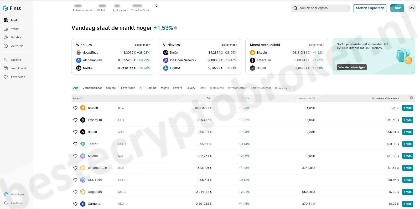 Dit platform is perfect voor beginners en mensen die niet te veel gedoe willen. Je vindt er alles wat je nodig hebt om slim te handelen. Na Bitvavo, gaan we kijken naar Finst.
